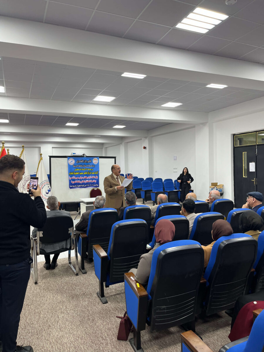 22/12/2025شارك اتحاد أدباء وكتَّاب ديالى في احتفال القسم بيوم اللغة العربية العالمي بمهرجان شعري ألقى فيه الشعراء جلال عبد الله خلف، غزاي درع الطائي، وحيدة حسين، عبد الكريم الجشعمي، غسان الدليمي، إنعام الحمداني، محمد العقابي، خالد القيسي، عبد الله عدنان، فيضاً من إبداعهم المتميز قتيبة حيدر، بحضور نخبة من مثقفي المحافظة، وقد تمَّ تكريمهم من قبل أ.د ثابت عبد الرزاق ظاهر عميد الكلية بشهادات تقدير، تعبر عن الاعتزاز بالاتحاد وتمتين أواصر التعاون معه.